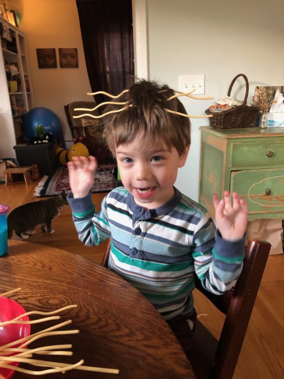 Myron has always been an observant kid, and he is good at following and sticking with his interests. When he was fascinated with wheels, he would find wheels in places I didn’t know wheels existed. He would see a pattern on a park bench that looked somewhat round and call it a wheel. In the peak of his dinosaur fandom, he learned names and distinct roars for probably at least 20 species. Dinosaurs seem to have given way to superheroes now. And where once everything was a wheel, now at age 4, every household object is a costume.