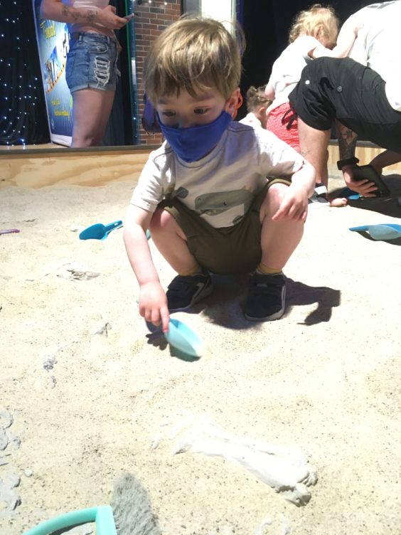 We all came down with COVID. After isolating for about 2 weeks, we went on a major adventure: taking the commuter rail to a dinosaur safari in Boston – involving animatronic dinosaurs. This was also the first full-size train ride Myron had been on. Previously, we had only been on a couple of miniature trains together. So it was mind-blowing on two fronts. Em thought it might have been too much and overwhelm Myron, but it turned out to be just right. He ran around naming all the dinosaurs, even some relatively obscure ones like iguanodon and pachycephalosaurus. Myron and I head-butted in front of the pachycephalosaurus. In front of one of the large dinosaurs, another adult visitor came up to it, and Myron said, “Watch out. It might eat you!”.