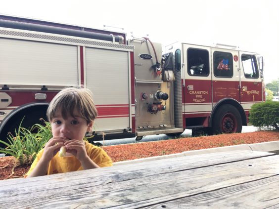 With Myron’s new skill, he moved up to the Preschool room and joined his old classmates. One day when Em came to pick him up during his first week, one of his teachers stopped her and said, “the funniest thing happened today.” Then his other teacher came and said, “the funniest thing happened today.” This class sometimes combines on the playground with the next class up. In one of those combined playground sessions, some older kids approached Myron and asked what his name was. As the teachers recounted it, Myron responded “I’m the boss.” Then the older kids replied, “No, what’s your real name?”, to which Myron just repeated, “I’m the boss” and then beeped and acted like a robot. Later, we learned that he was actually saying, “I’m the bus”, which explained the beeping. We have been enjoying our multi-modal bike and bus commute to school.